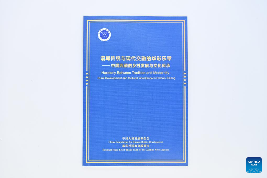 This undated photo shows a copy of the think tank report “Harmony Between Tradition and Modernity: Rural Development and Cultural Inheritance in China’s Xizang.” A think tank report released on Thursday hailed the practical achievements of rural development in southwest China’s Xizang Autonomous Region since its founding 60 years ago.Titled “Harmony Between Tradition and Modernity: Rural Development and Cultural Inheritance in China’s Xizang,” the report was jointly published by China Foundation For Human Rights Development and National High-Level Think Tank of Xinhua News Agency in both Chinese and English. (Xinhua/Li Xin)